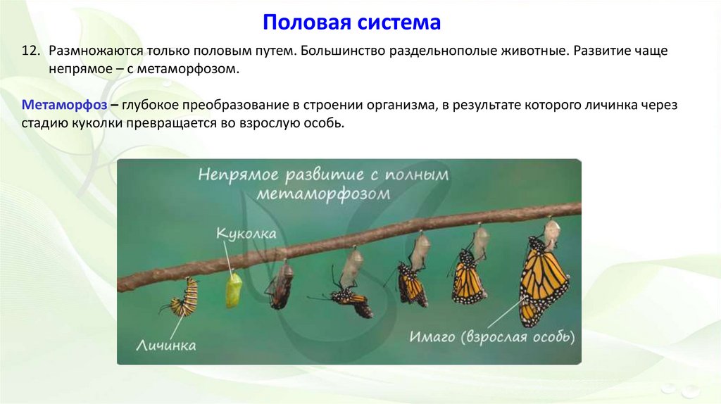 Половая система12. Размножаются только половым путем. Большинство раздельнополые животные. Развитие чаще