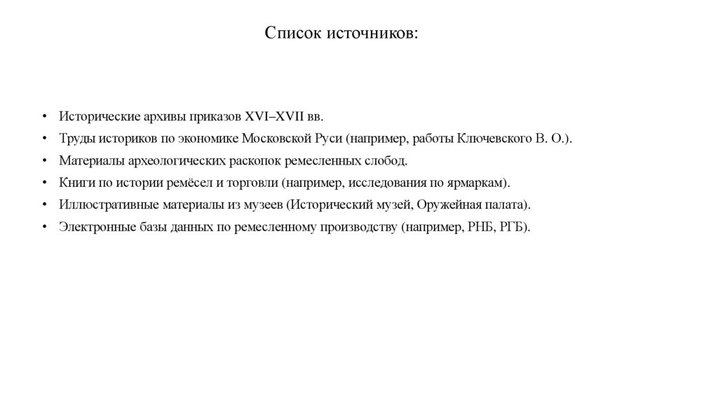 • Труды историков по экономике Московской Руси (например, работы Ключевского В. О.).