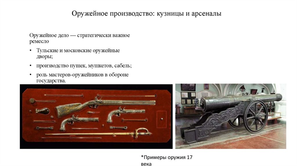 • производство пушек, мушкетов, сабель;
