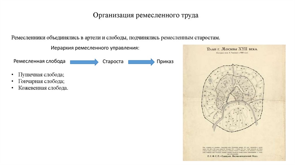 Организация ремесленного трудаРемесленники объединялись в артели и слободы, подчинялись ремесленным старостам.