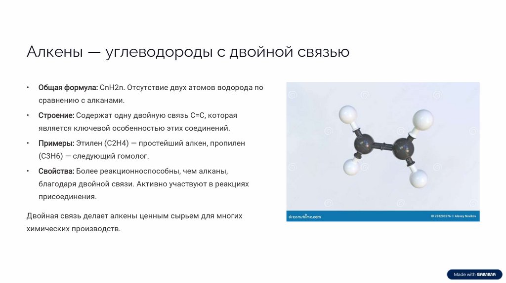 Алкены — углеводороды с двойной связьюОбщая формула: CnH2n. Отсутствие двух атомов водорода по