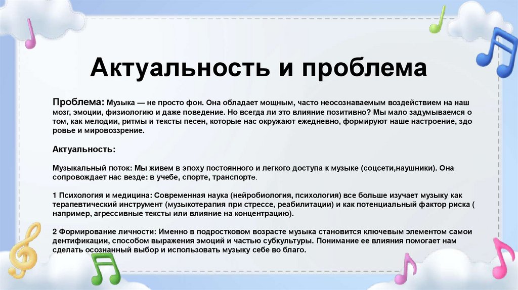 Актуальность и проблемаПроблема: Музыка — не просто фон. Она обладает мощным, часто неосознаваемым воздействием на наш