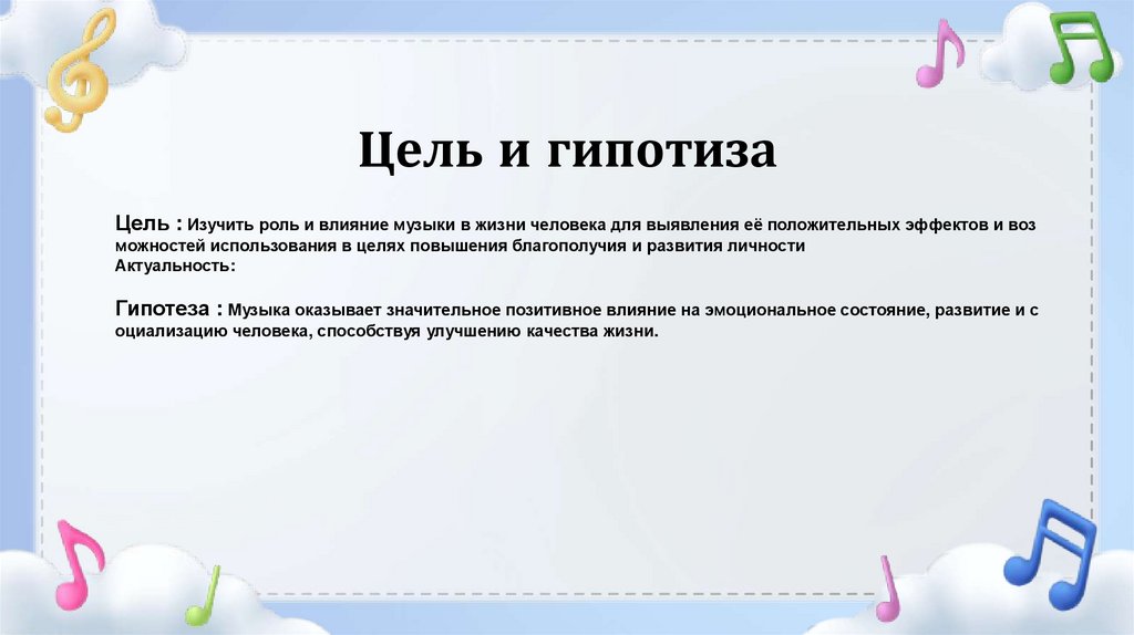Цель и гипотизаЦель : Изучить роль и влияние музыки в жизни человека для выявления её положительных эффектов и воз