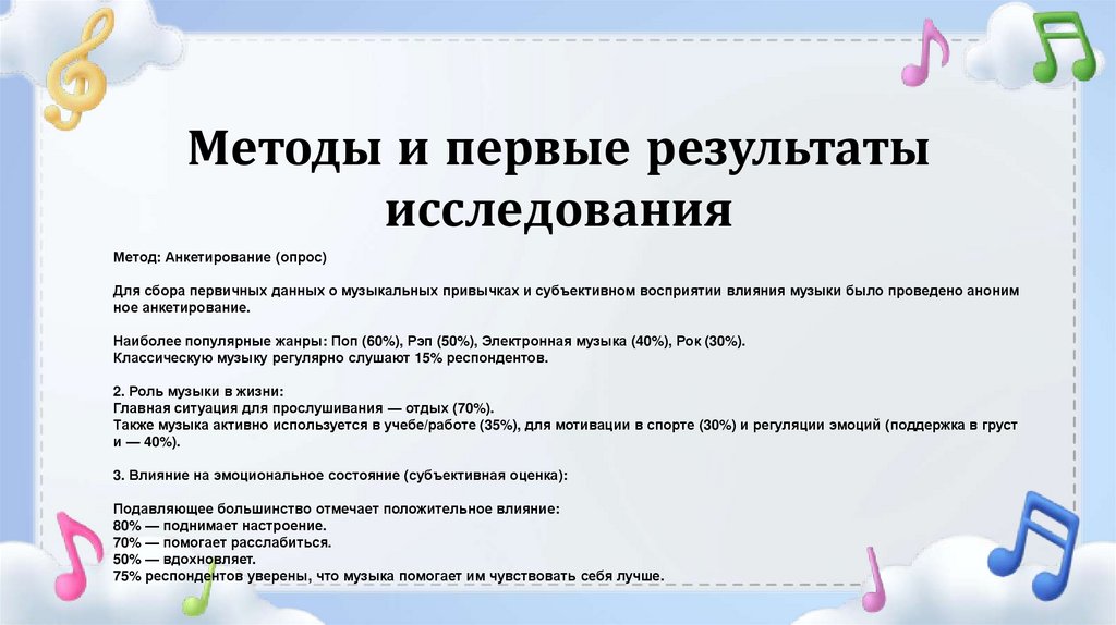 Для сбора первичных данных о музыкальных привычках и субъективном восприятии влияния музыки было проведено аноним