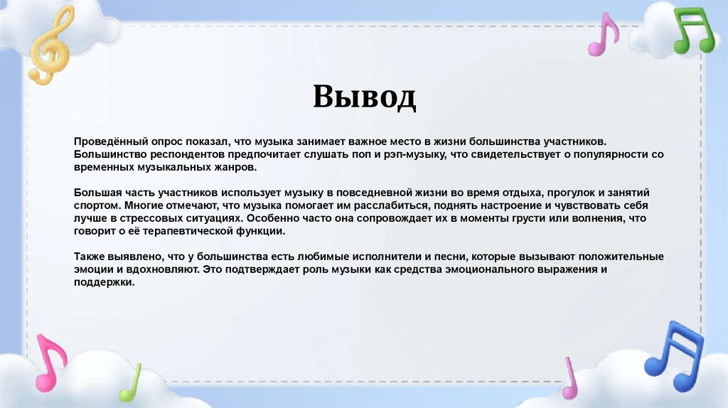 В целом, результаты опроса свидетельствуют о том, что музыка — это мощный инструмент, который помогает