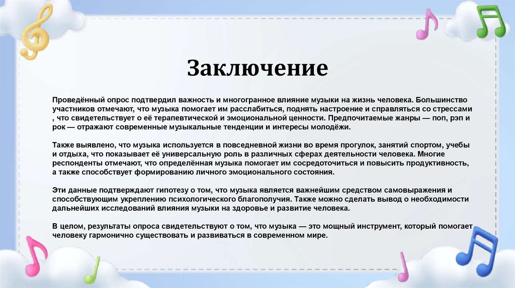 ЗаключениеПроведённый опрос подтвердил важность и многогранное влияние музыки на жизнь человека. Большинство