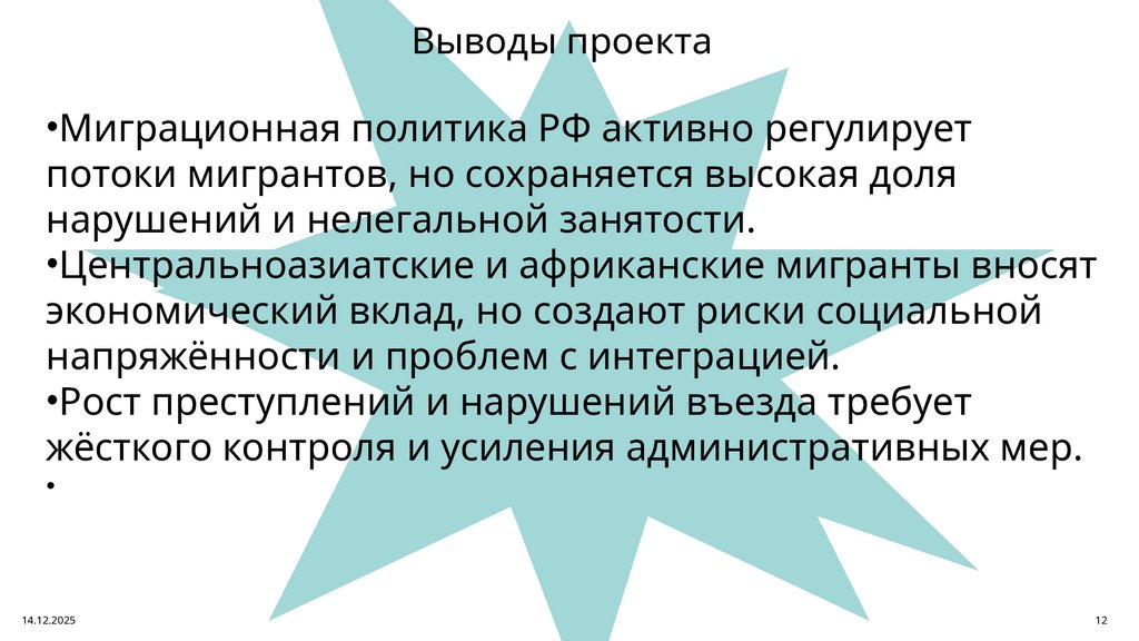 Выводы проекта•Миграционная политика РФ активно регулирует