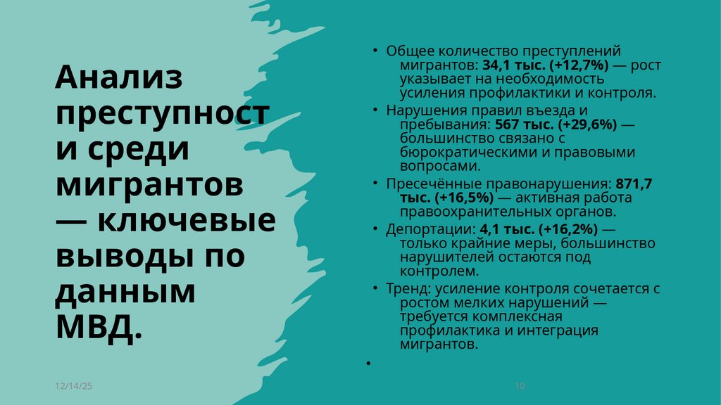 • Общее количество преступлениймигрантов: 34,1 тыс. (+12,7%) — рост