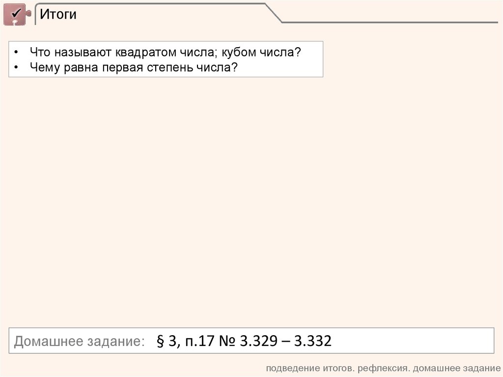 Итоги• Что называют квадратом числа; кубом числа?