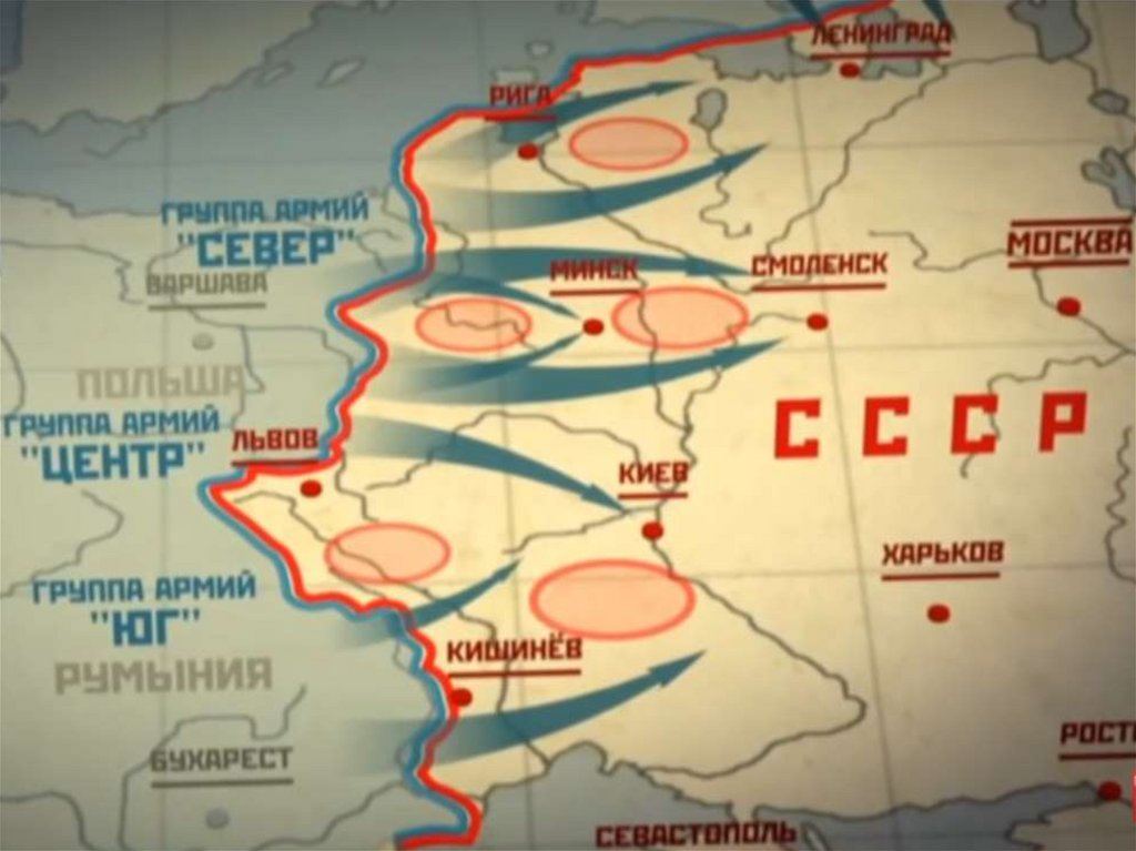• 22 июня 1941 г. в 4 часа утра без объявлениявойны германские войска напали на СССР.