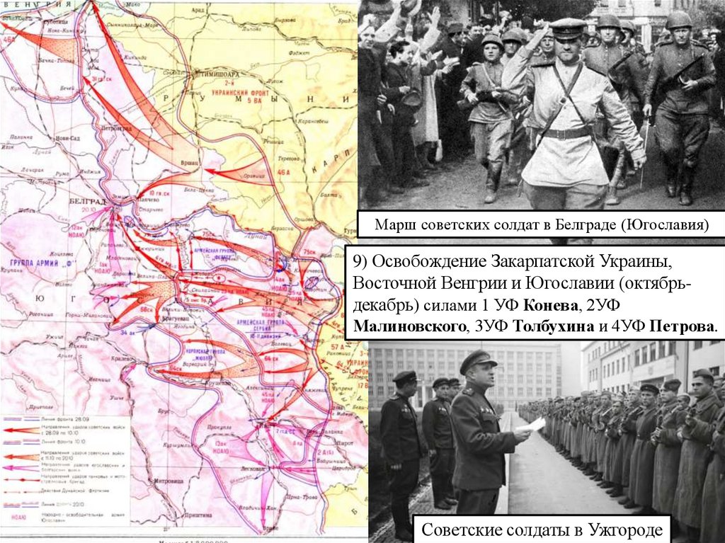 Марш советских солдат в Белграде (Югославия)9) Освобождение Закарпатской Украины,