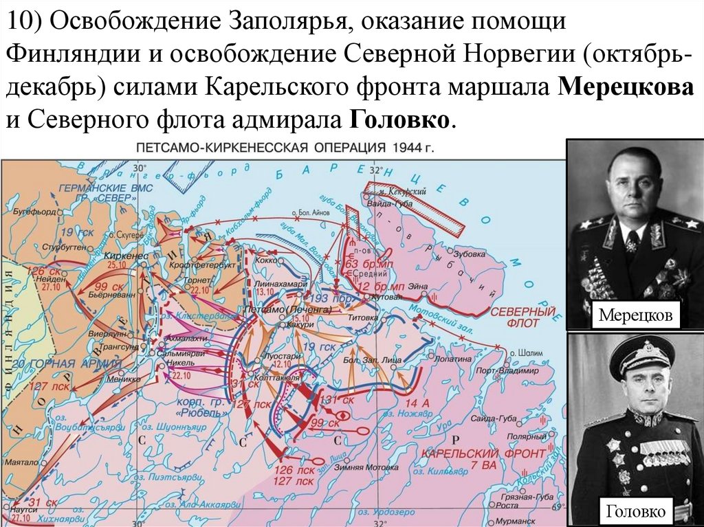 10) Освобождение Заполярья, оказание помощиФинляндии и освобождение Северной Норвегии (октябрьдекабрь) силами Карельского фронта маршала Мерецкова