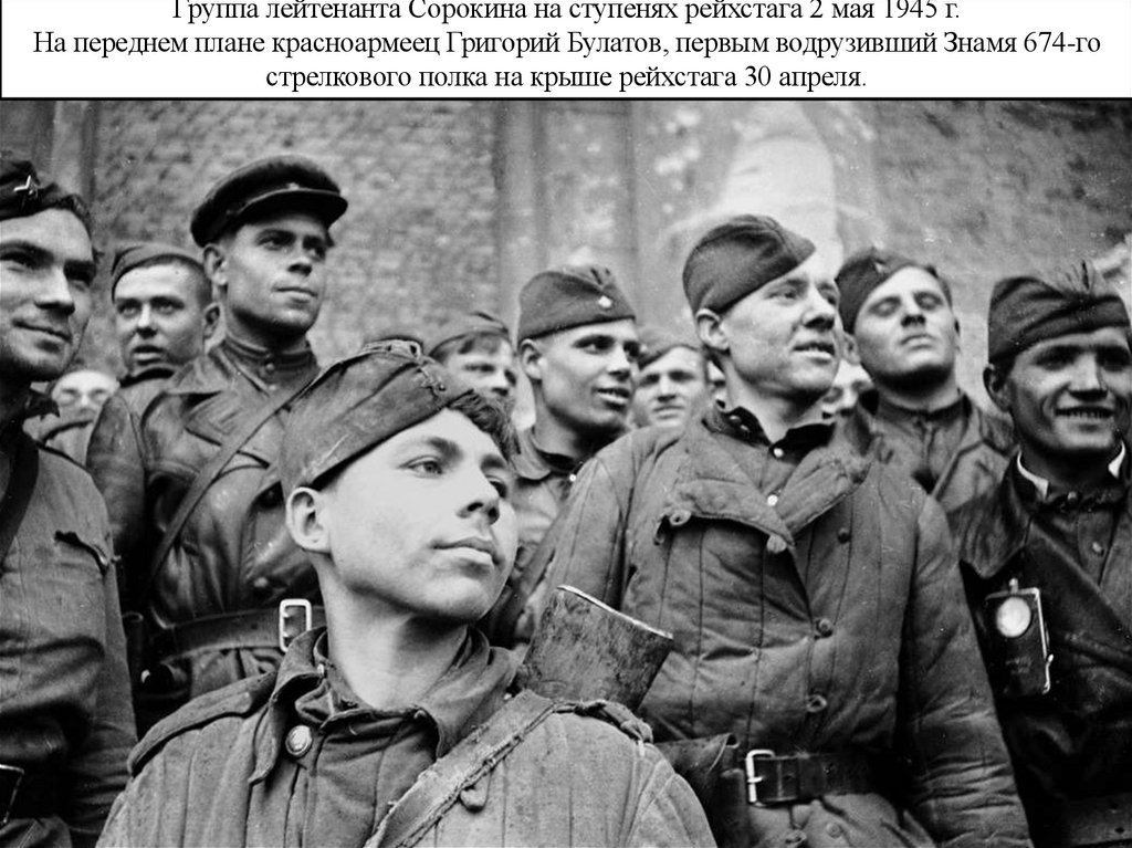 Группа лейтенанта Сорокина на ступенях рейхстага 2 мая 1945 г.На переднем плане красноармеец Григорий Булатов, первым водрузивший Знамя 674-го