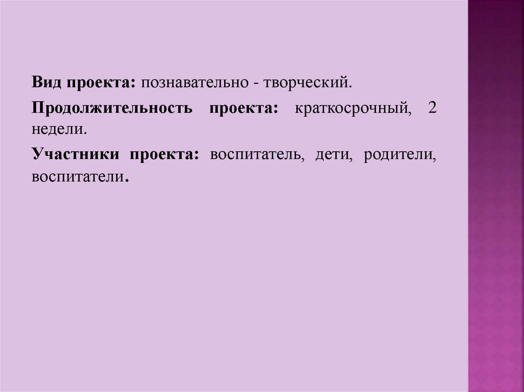 Вид проекта: познавательно - творческий.Продолжительность проекта: краткосрочный, 2