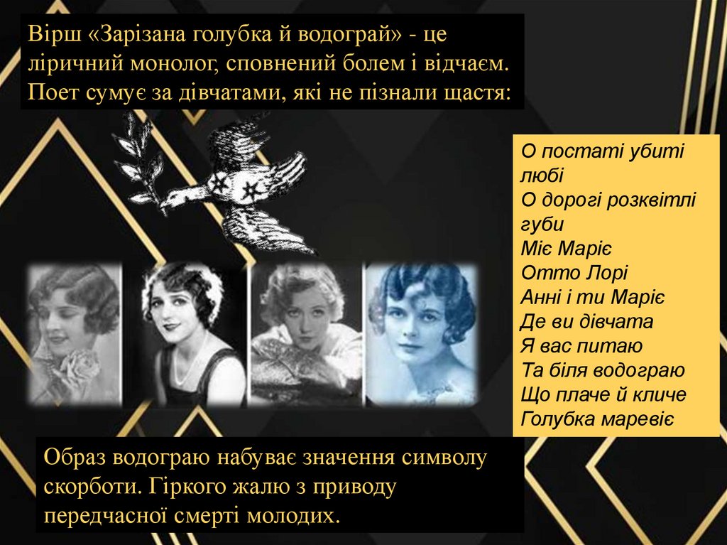Вірш «Зарізана голубка й водограй» - целіричний монолог, сповнений болем і відчаєм.