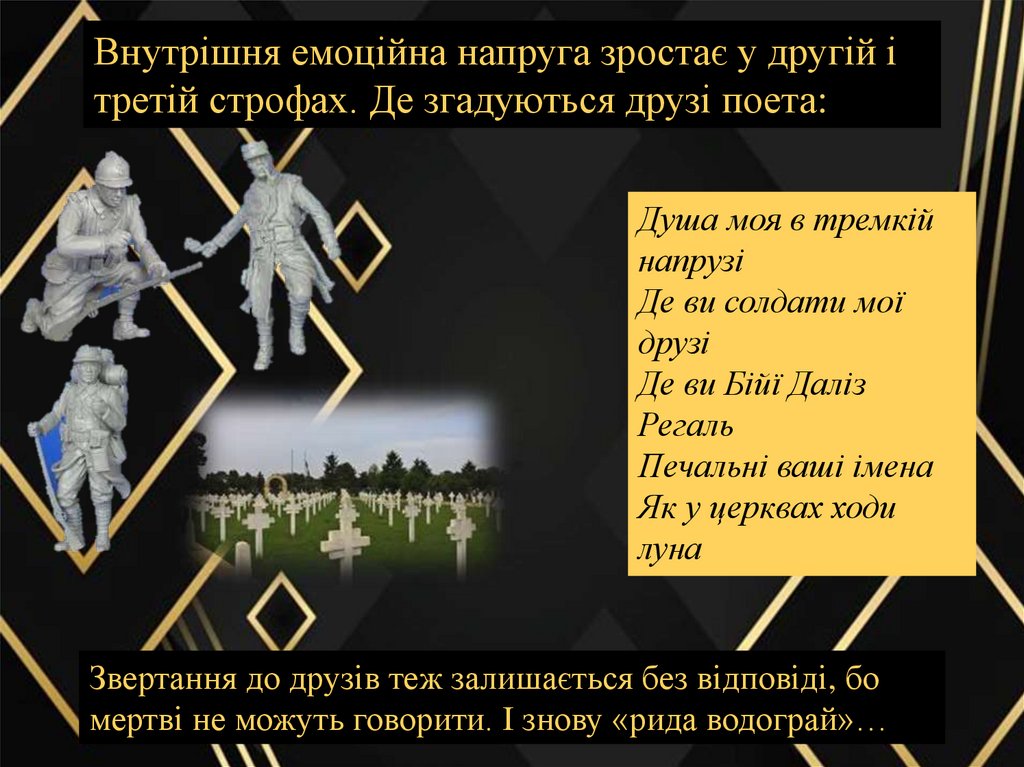 Внутрішня емоційна напруга зростає у другій ітретій строфах. Де згадуються друзі поета: