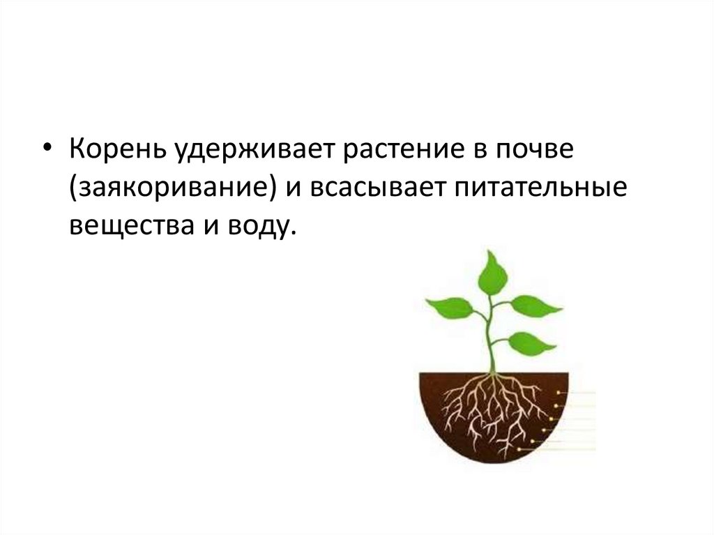 • Корень удерживает растение в почве(заякоривание) и всасывает питательные
