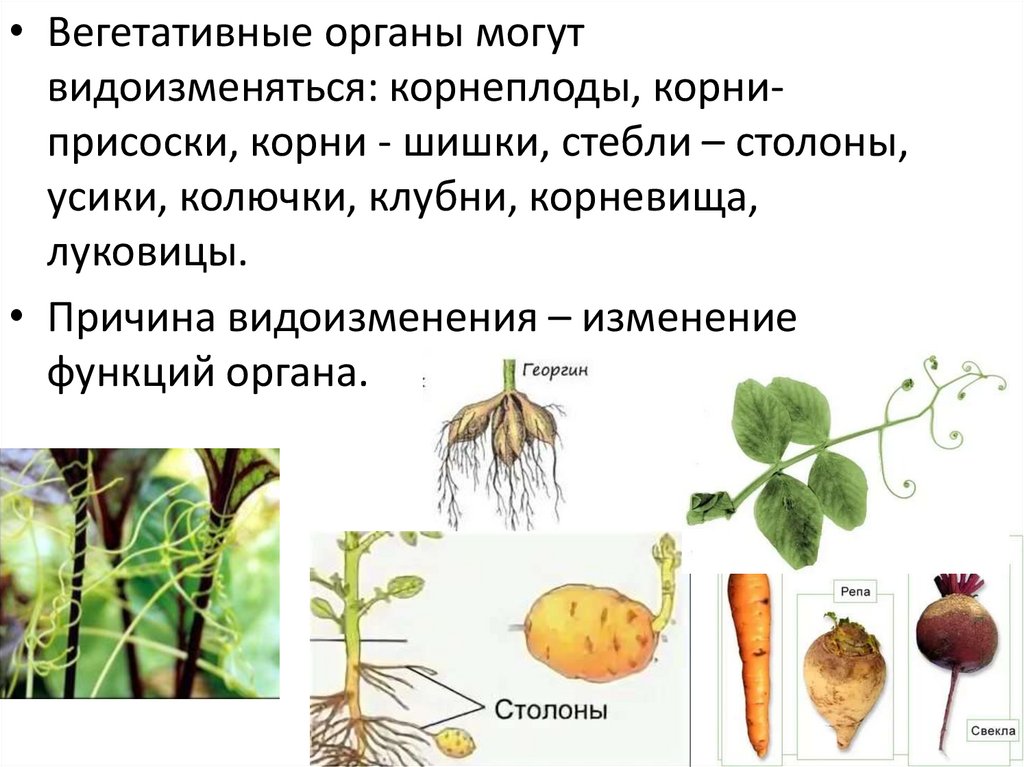 • Вегетативные органы могутвидоизменяться: корнеплоды, корниприсоски, корни - шишки, стебли – столоны,
