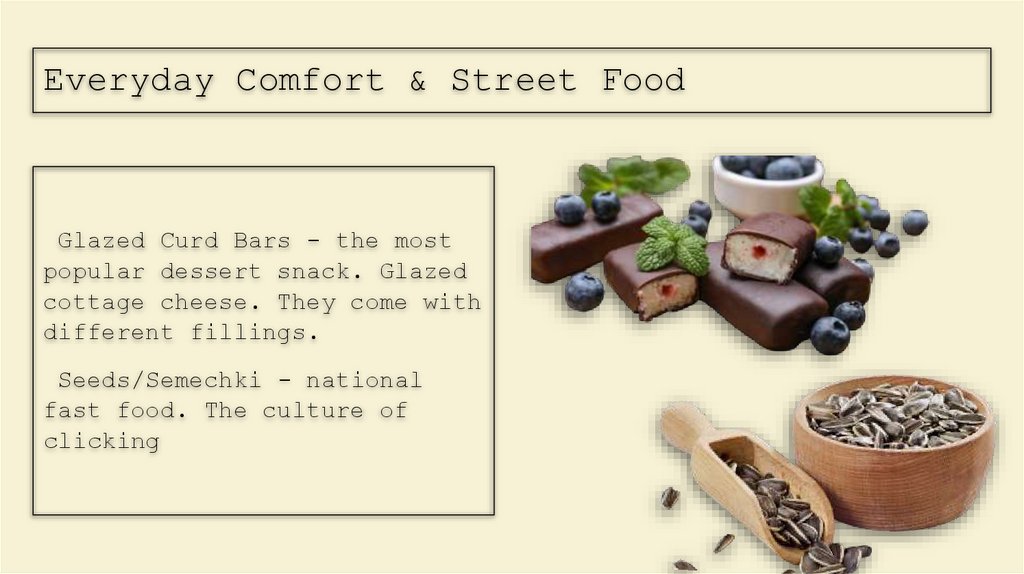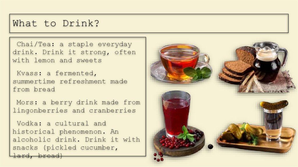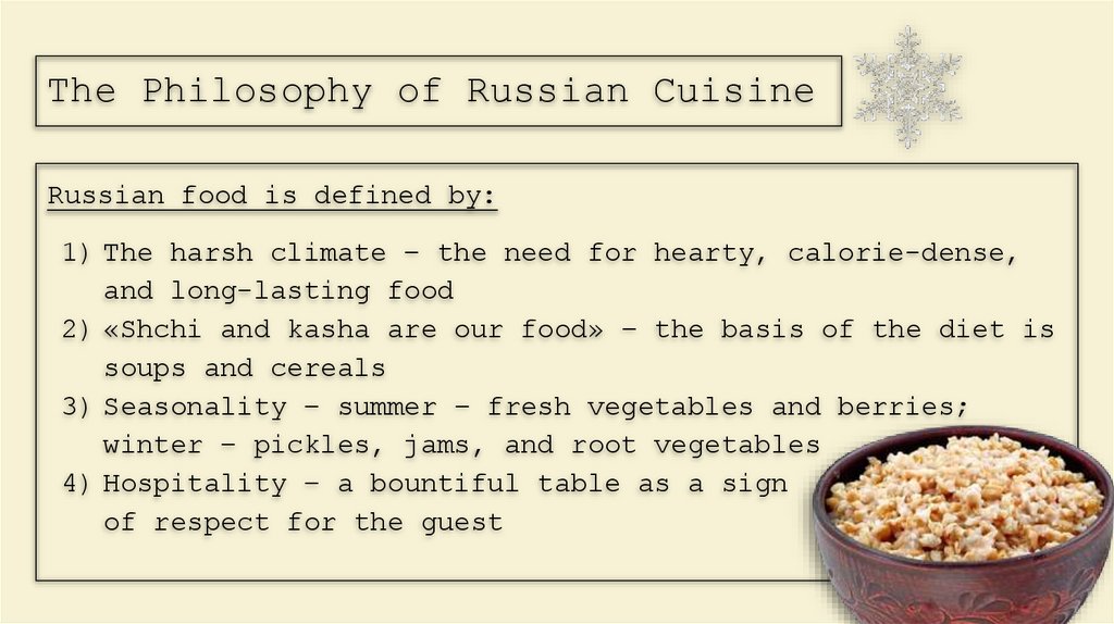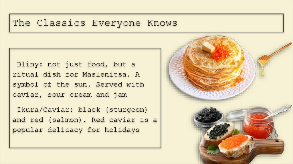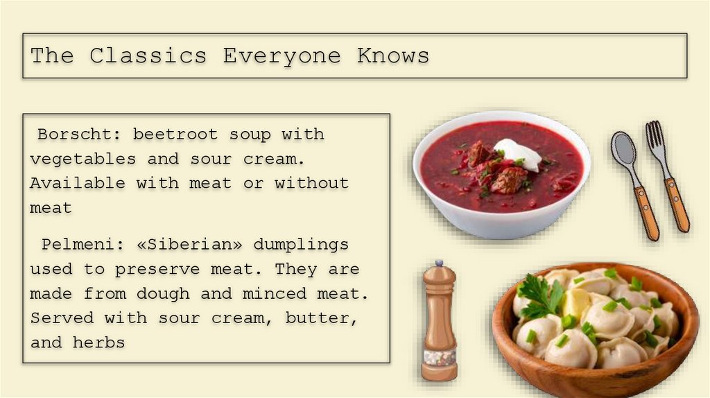 food—from borscht to curd cheese. Russian cuisine is welcoming
