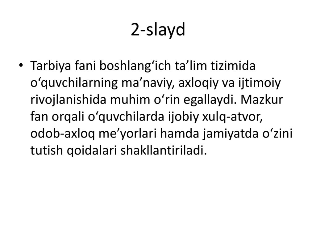 2-slayd• Tarbiya fani boshlang‘ich ta’lim tizimida