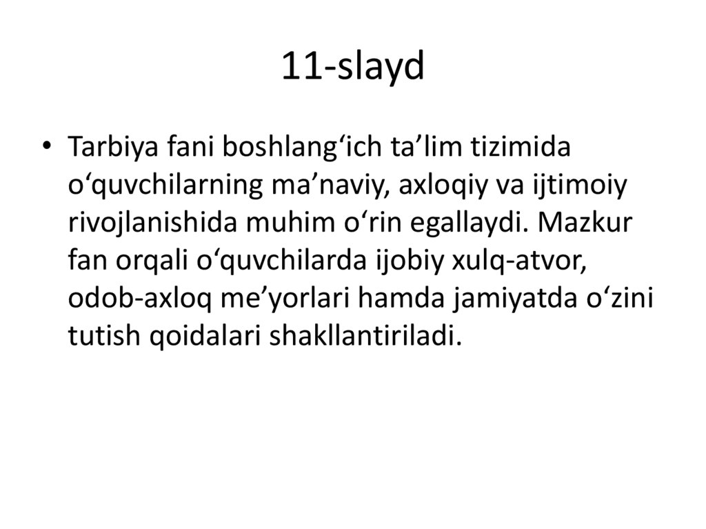 11-slayd• Tarbiya fani boshlang‘ich ta’lim tizimida
