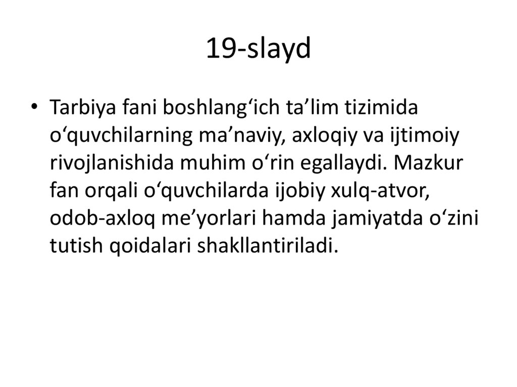 19-slayd• Tarbiya fani boshlang‘ich ta’lim tizimida