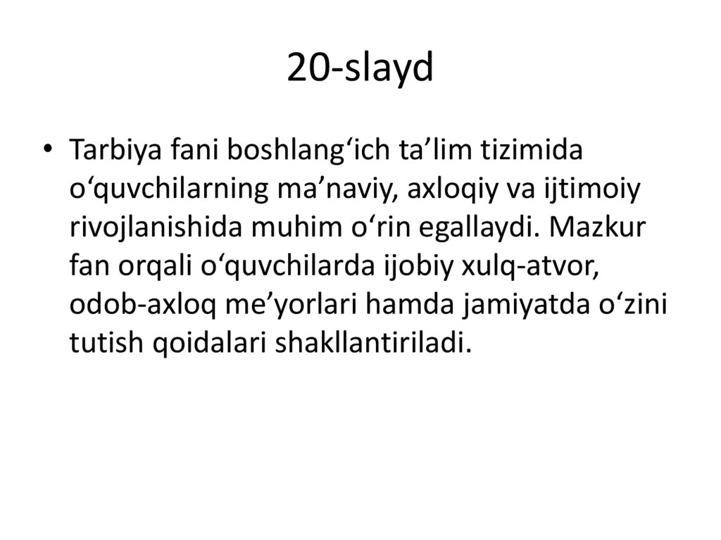 20-slayd• Tarbiya fani boshlang‘ich ta’lim tizimida