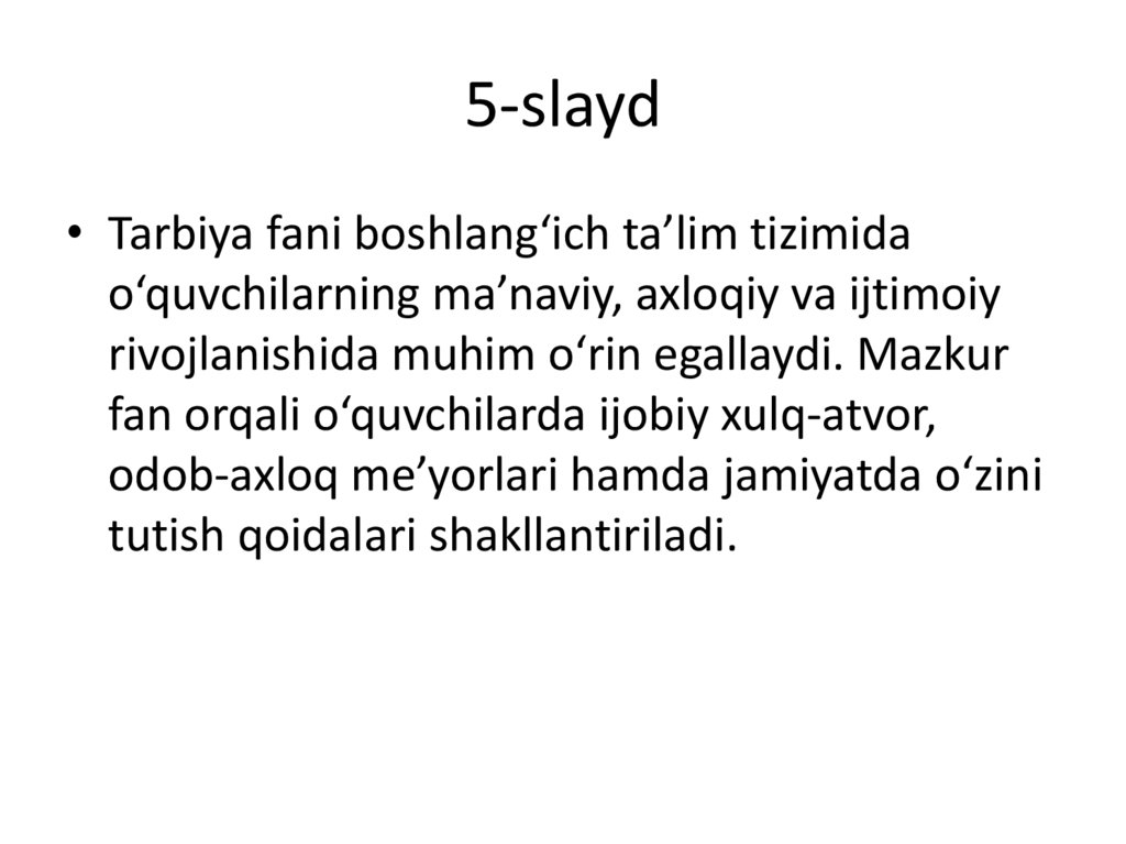 5-slayd• Tarbiya fani boshlang‘ich ta’lim tizimida