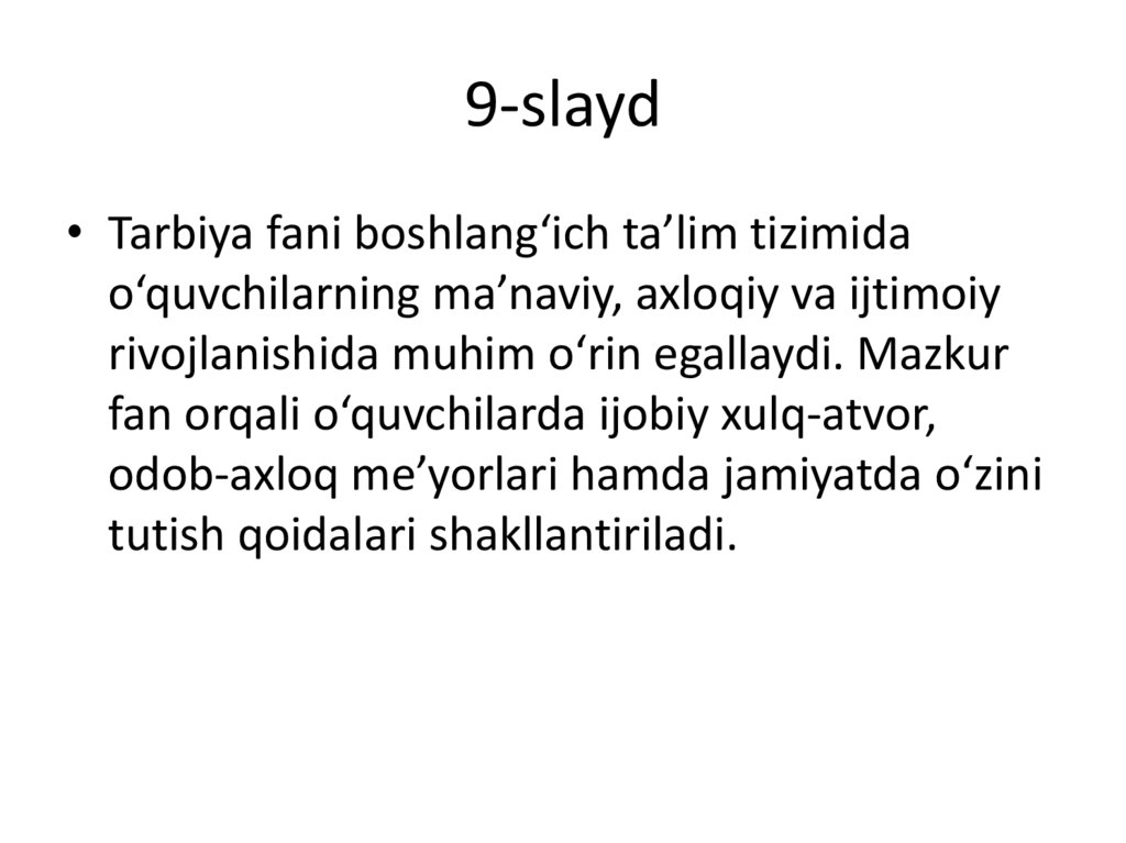 9-slayd• Tarbiya fani boshlang‘ich ta’lim tizimida