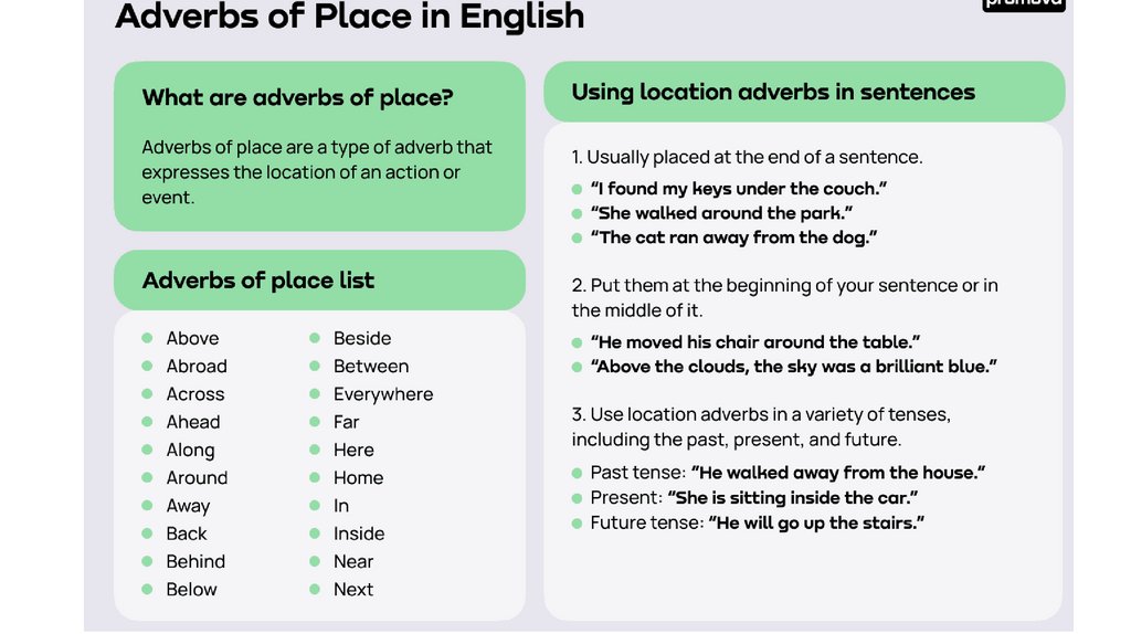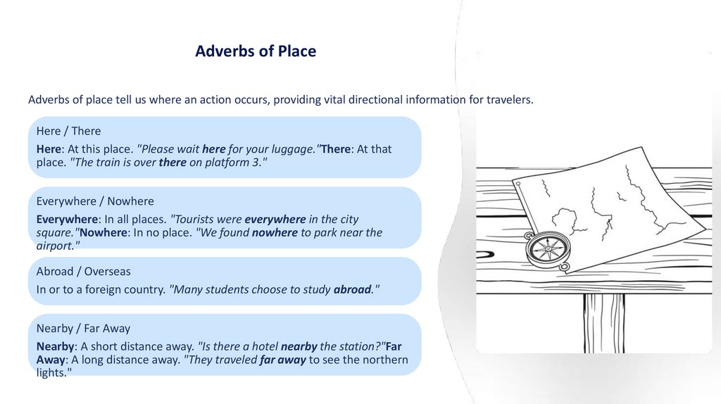 Adverbs of PlaceAdverbs of place tell us where an action occurs, providing vital directional information for travelers.