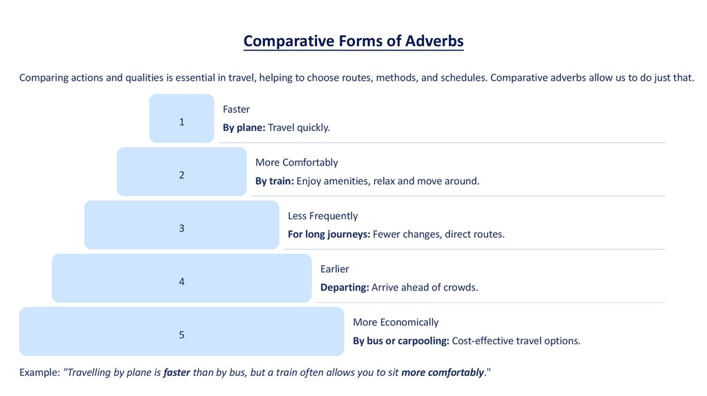 Comparative Forms of AdverbsComparing actions and qualities is essential in travel, helping to choose routes, methods, and schedules. Comparative adverbs allow us to do just that.
