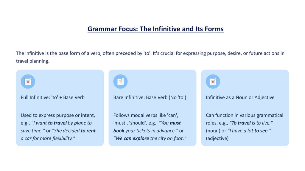 Grammar Focus: The Infinitive and Its FormsThe infinitive is the base form of a verb, often preceded by 'to'. It's crucial for expressing purpose, desire, or future actions in