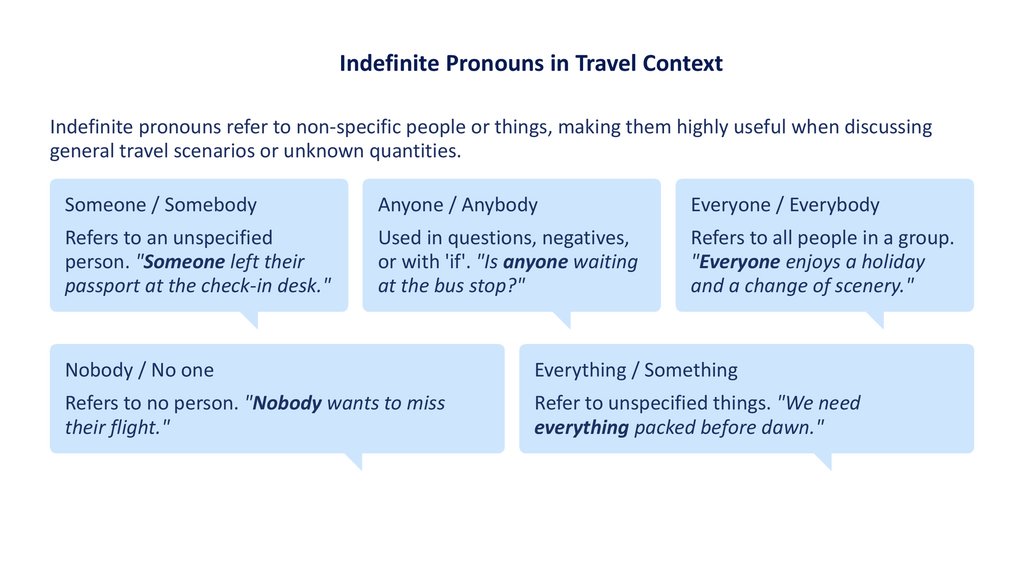 Indefinite Pronouns in Travel ContextIndefinite pronouns refer to non-specific people or things, making them highly useful when discussing