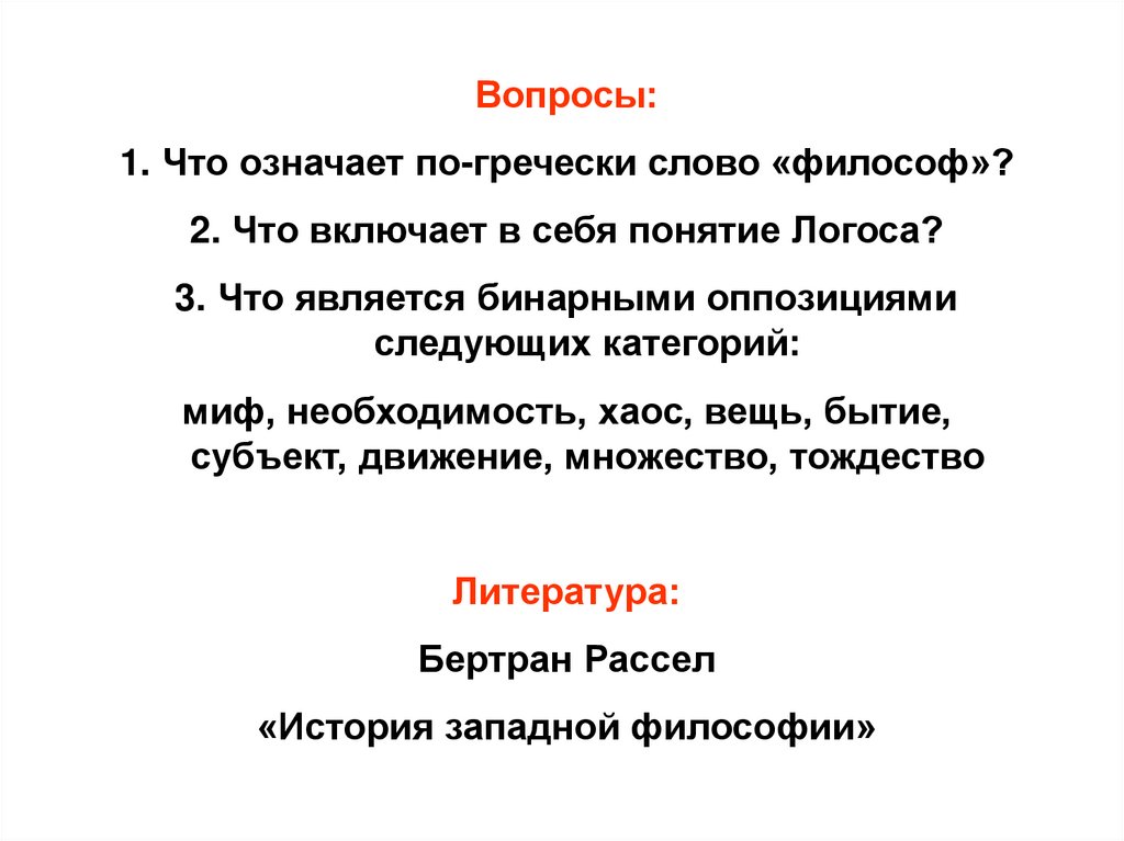 Вопросы:1. Что означает по-гречески слово «философ»?