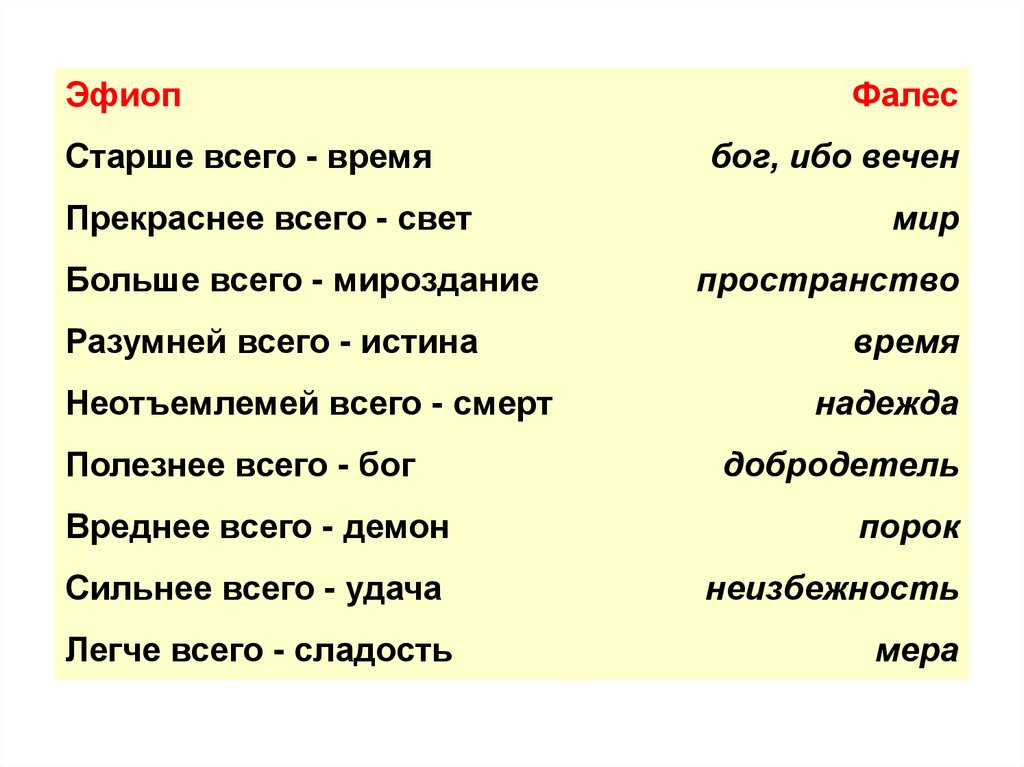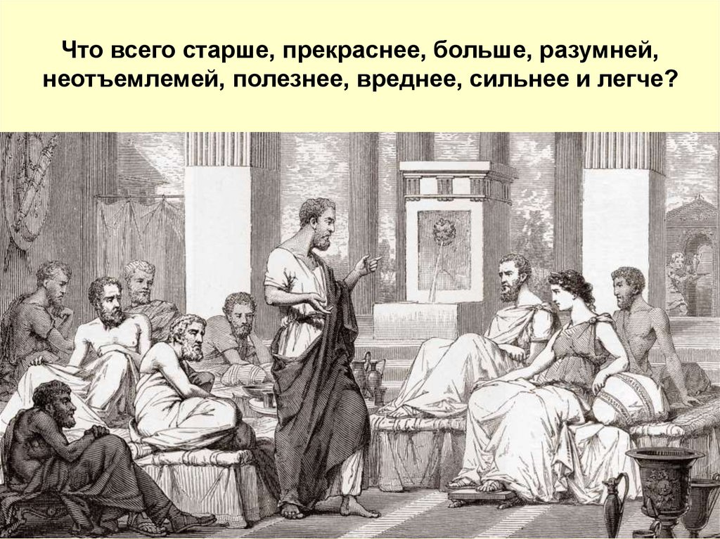 Что всего старше, прекраснее, больше, разумней,неотъемлемей, полезнее, вреднее, сильнее и легче?