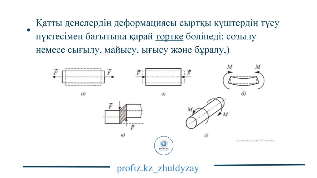 Қатты денелердің деформациясы сыртқы күштердің түсунүктесімен бағытына қарай төртке бөлінеді: созылу