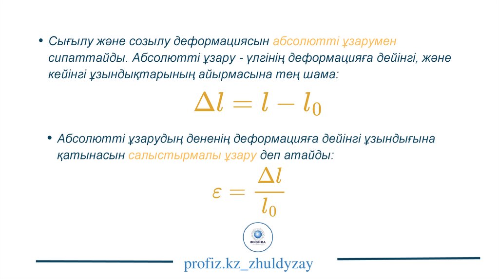 Сығылу және созылу деформациясын абсолютті ұзаруменсипаттайды. Абсолютті ұзару - үлгінің деформацияға дейінгі, және