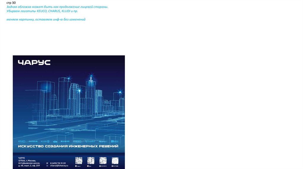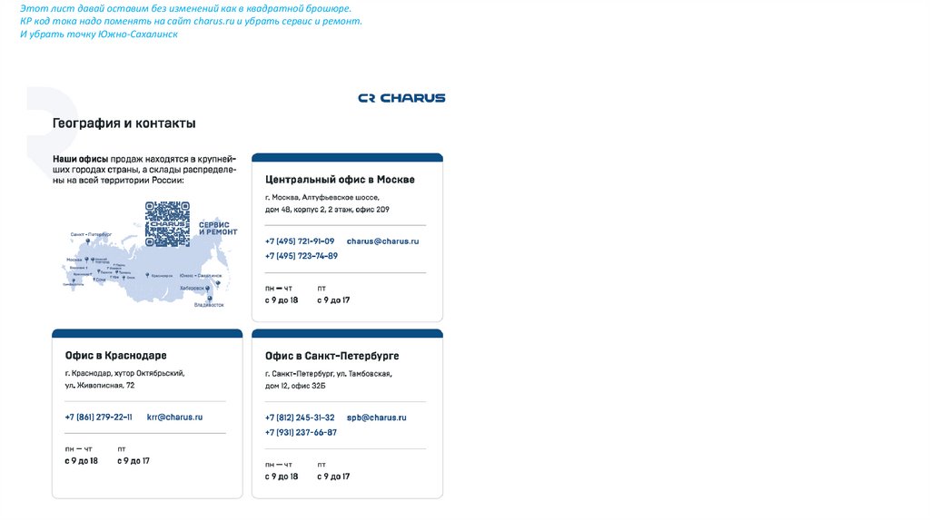Этот лист давай оставим без изменений как в квадратной брошюре.КР код тока надо поменять на сайт charus.ru и убрать сервис и ремонт.