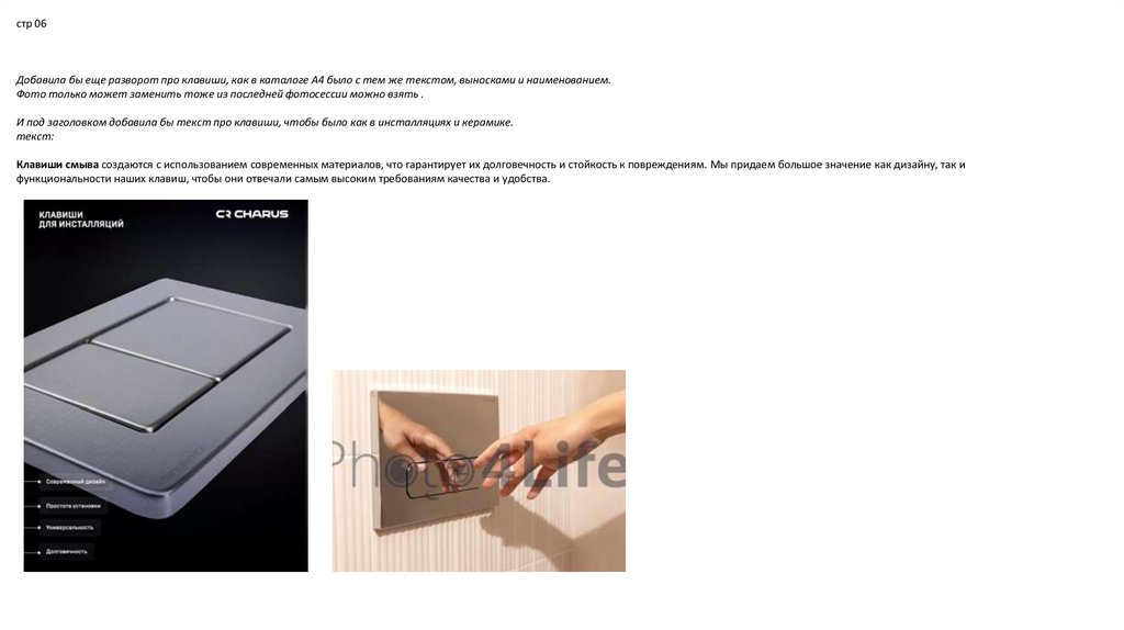 стр 06Добавила бы еще разворот про клавиши, как в каталоге А4 было с тем же текстом, выносками и наименованием.