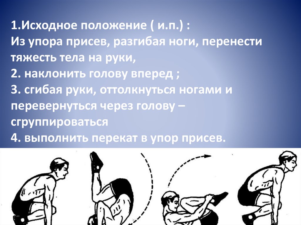 1.Исходное положение ( и.п.) :Из упора присев, разгибая ноги, перенести