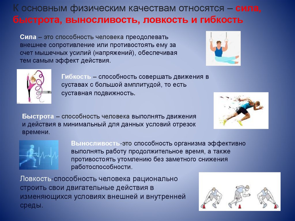 К основным физическим качествам относятся – сила,быстрота, выносливость, ловкость и гибкость