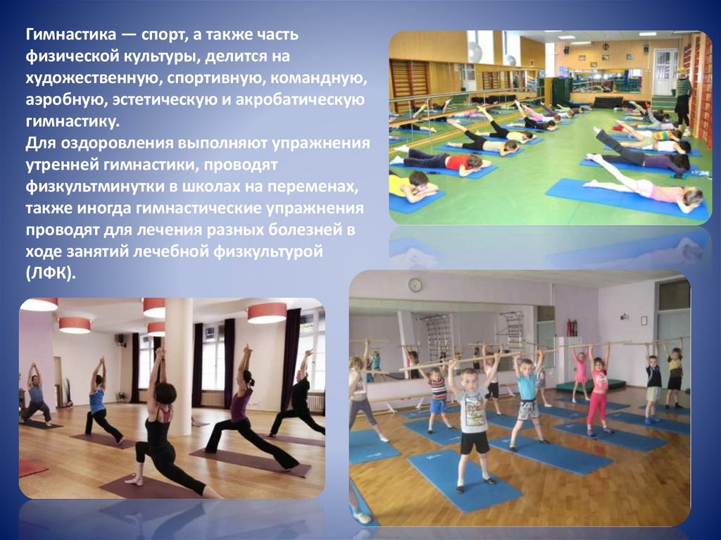 Гимнастика — спорт, а также частьфизической культуры, делится на