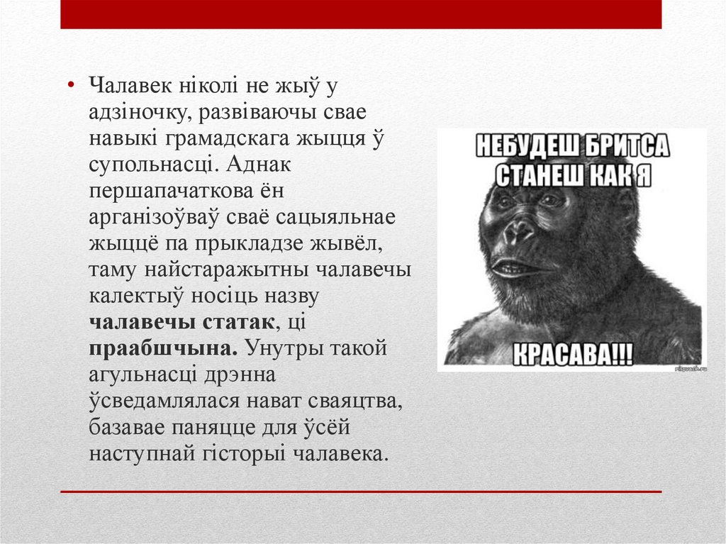 • Чалавек ніколі не жыў уадзіночку, развіваючы свае