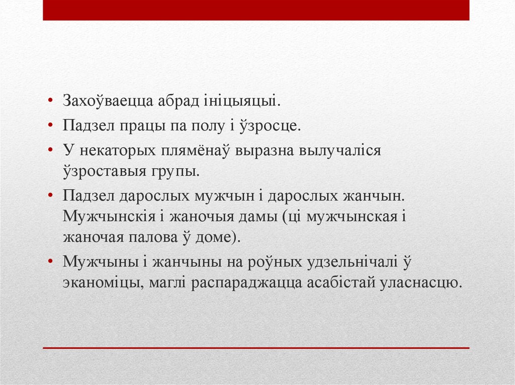 • Захоўваецца абрад ініцыяцыі.• Падзел працы па полу і ўзросце.