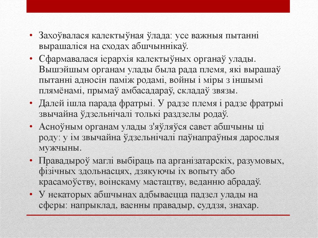 • Захоўвалася калектыўная ўлада: усе важныя пытаннівырашаліся на сходах абшчыннікаў.