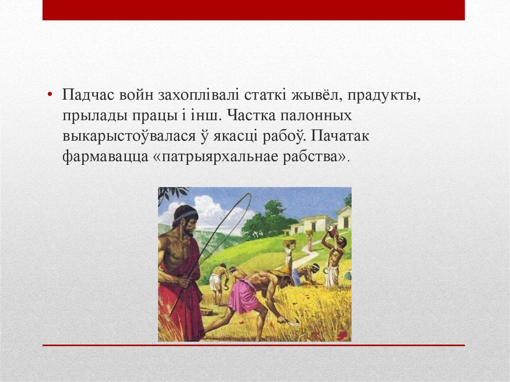 • Падчас войн захоплівалі статкі жывёл, прадукты,прылады працы і інш. Частка палонных