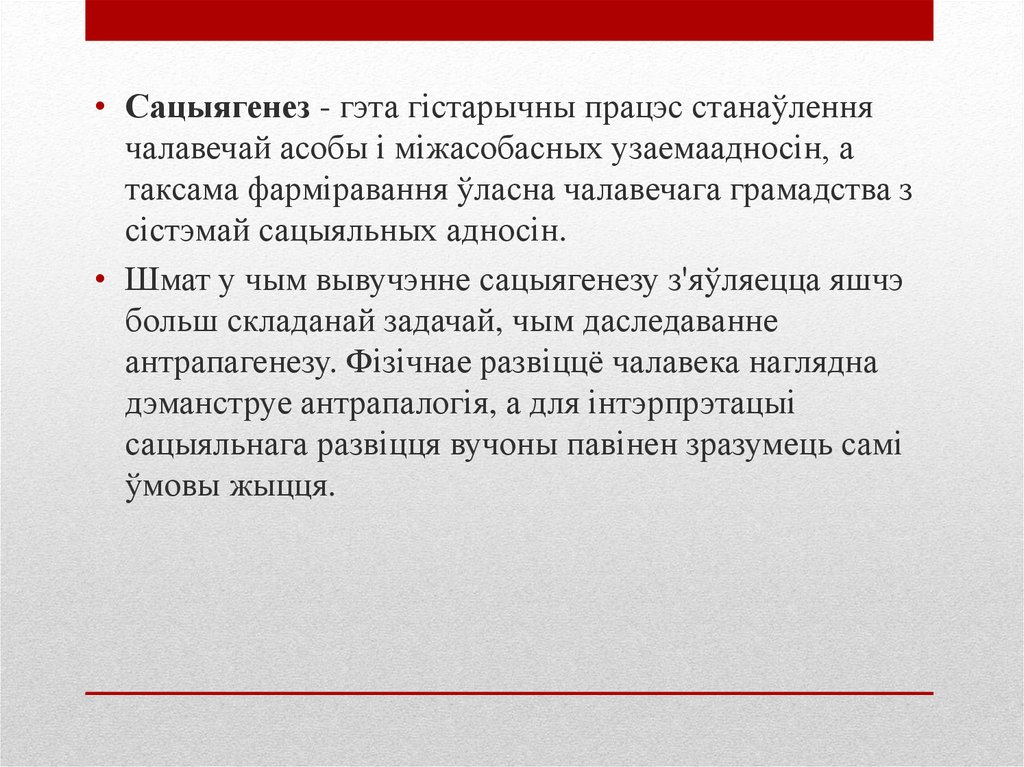 • Сацыягенез - гэта гістарычны працэс станаўленнячалавечай асобы і міжасобасных узаемаадносін, а