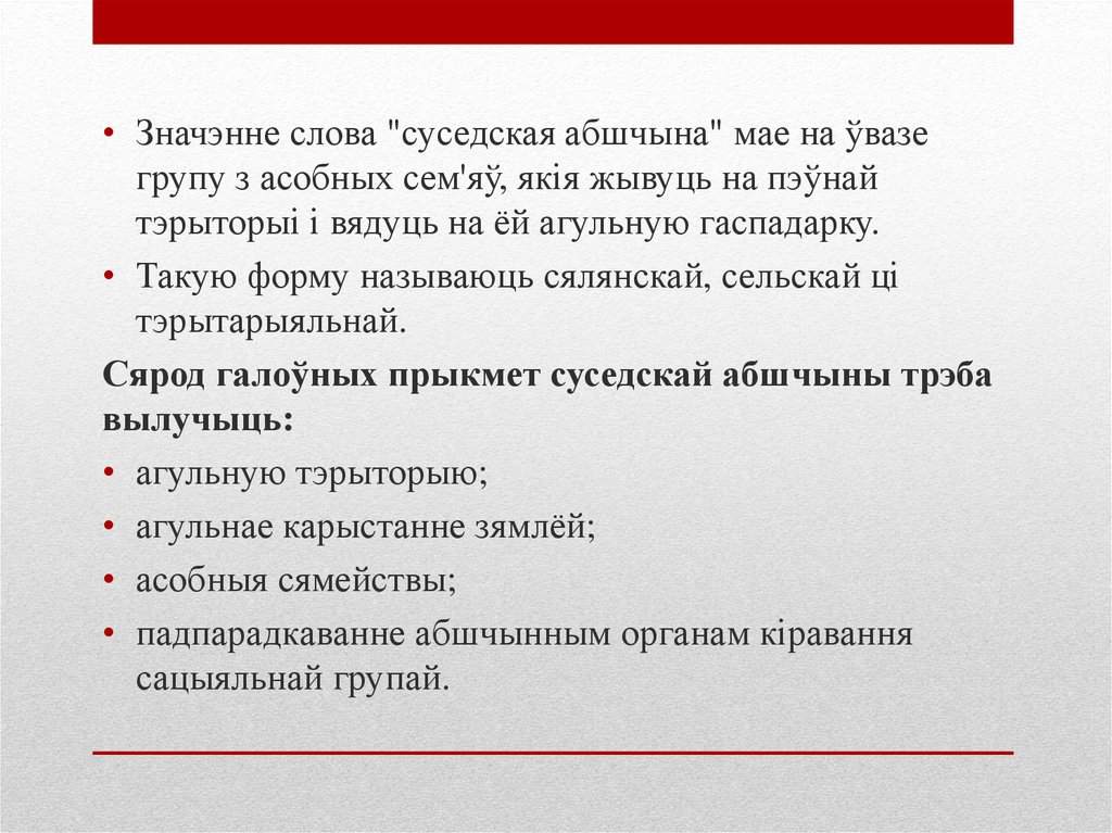 • Значэнне слова "суседская абшчына" мае на ўвазегрупу з асобных сем'яў, якія жывуць на пэўнай