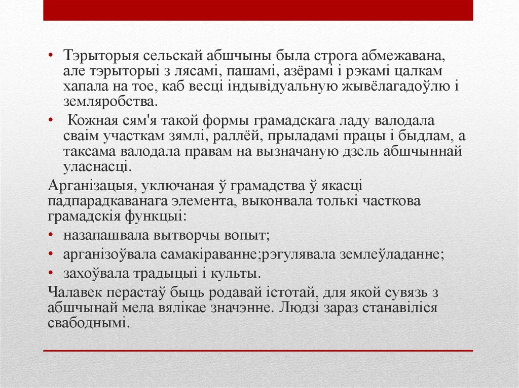 • Тэрыторыя сельскай абшчыны была строга абмежавана,але тэрыторыі з лясамі, пашамі, азёрамі і рэкамі цалкам