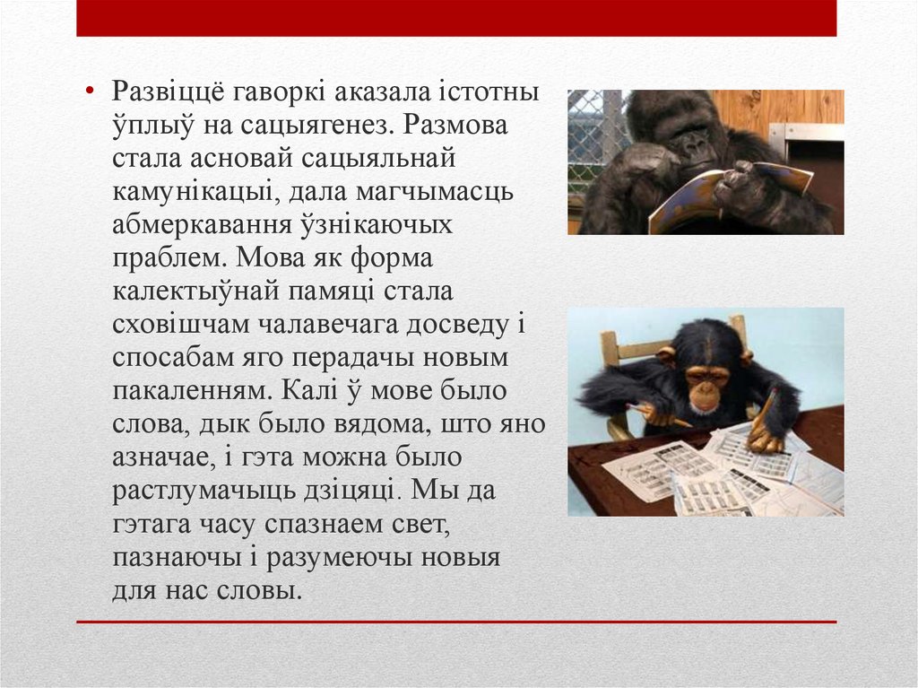 • Развіццё гаворкі аказала істотныўплыў на сацыягенез. Размова